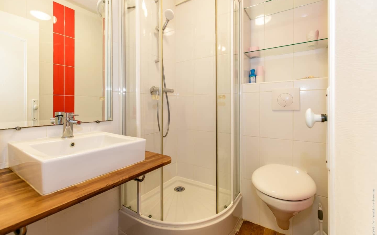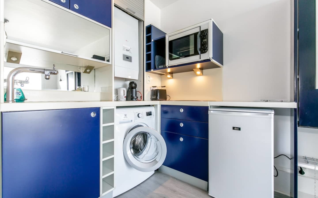 – Cuisine équipée (Four grill, cafetière à dosettes, grille-pain, bouilloire, plaques de cuisson, casseroles, vaisselle …) et fournie (Sel, Poivre, Huile, Pates …)